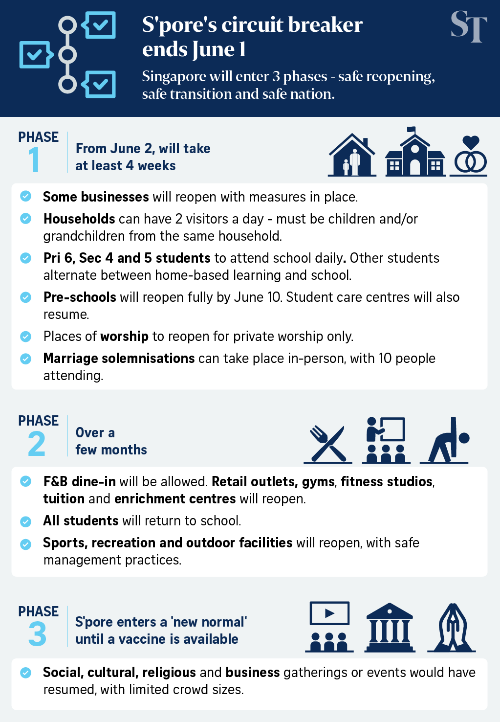Singapore COVID-19 Circuit Breaker ends on 1 June; economy will reopen in 3 phases. Phases 2 and 3 dates to be shared at a later date.